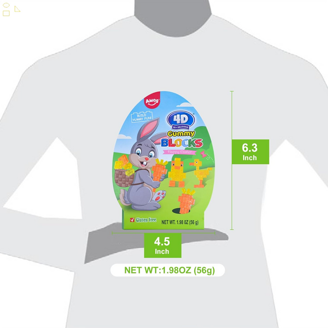 • Eggcellent Easter Treat: Delight in the Easter spirit with Amos Egg-shaped box filled with 4D Gummy Blocks, perfect for the occasion.