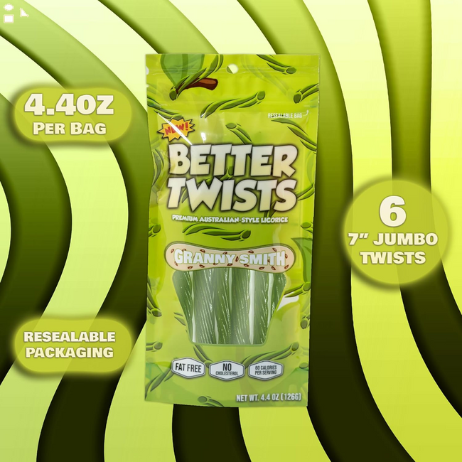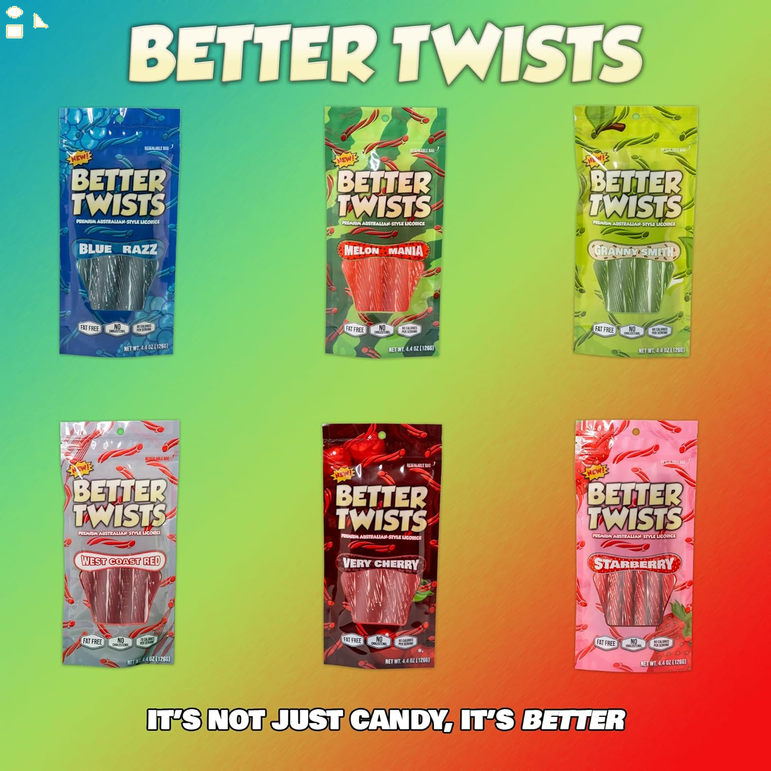 Introducing Better Twists, our gourmet Australian-style licorice featuring six tantalizing flavors in one convenient, resealable pouch. From the timeless allure of West Coast Red to the zesty kick of Granny Smith, every bite is an exquisite journey for your taste buds. Our licorice is crafted with the utmost care to ensure a delectable, flavorful tasting experience. With resealable packaging, your licorice stays , ensuring a premium treat whenever you desire. Satisfy your cravings and elevate your snacking experience with Better Twists, or share it as a tasteful gift with friends and family – a true delight for licorice enthusiasts and anyone with a discerning palate. As we say - It's not just candy, it's Better!