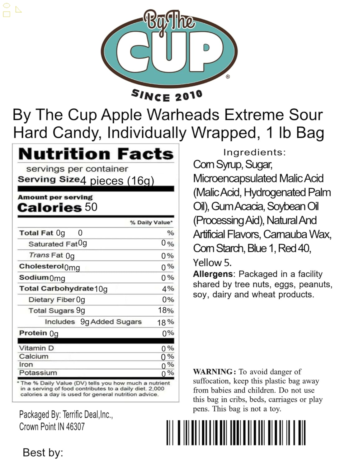 - 1 lb bag By The Cup Apple Warheads Extreme Sour (We changed the look of our bags you may receive either one until stock is depleted)