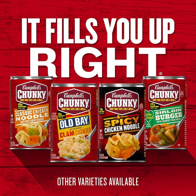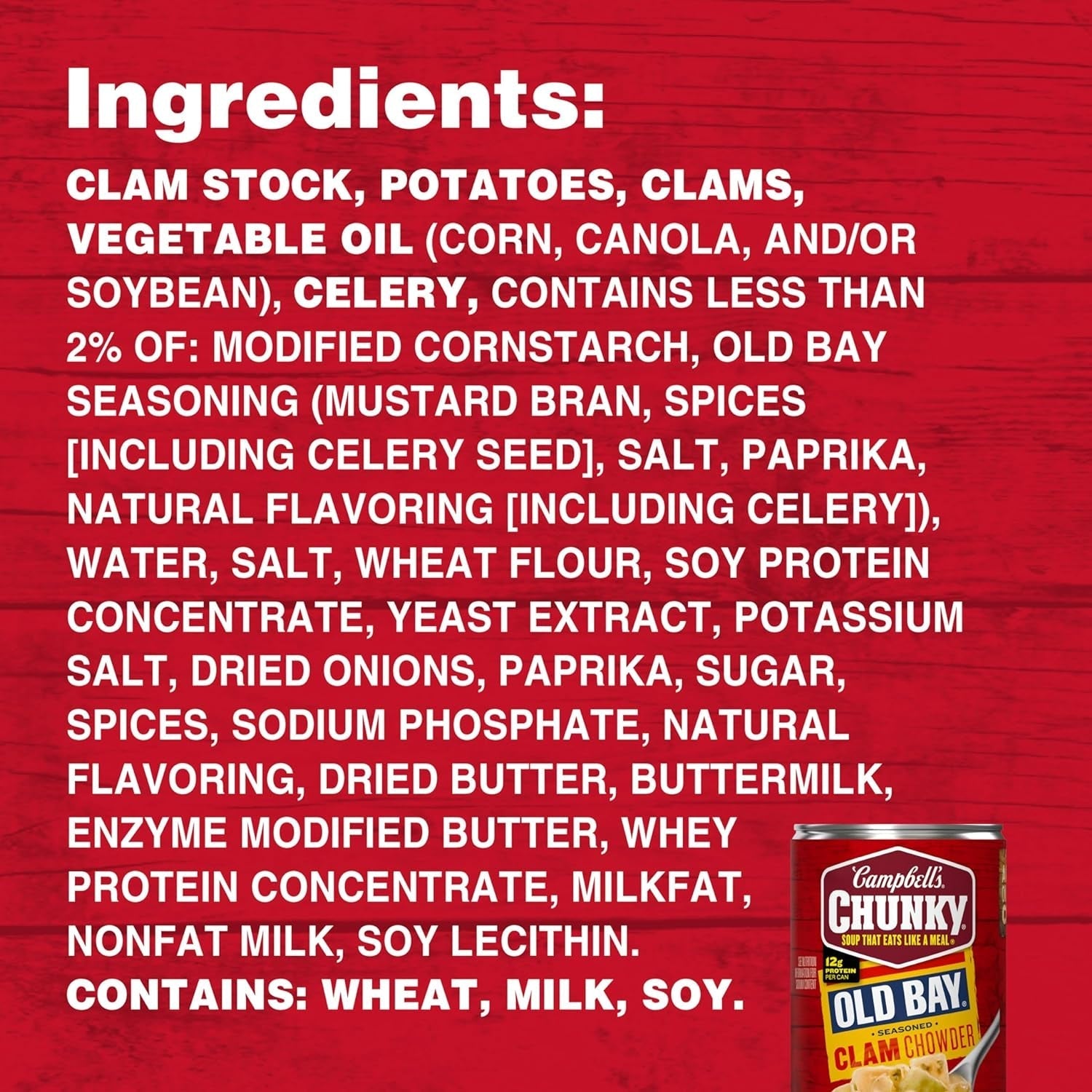 Campbell's Chunky Soup: One (1) 18.8 oz can of Campbell's Chunky OLD BAY Seasoned Clam Chowder Big Flavors: Clam chowder soup seasoned with OLD BAY and crafted with generous pieces of succulent clams and hearty potato chunks 12 grams of...