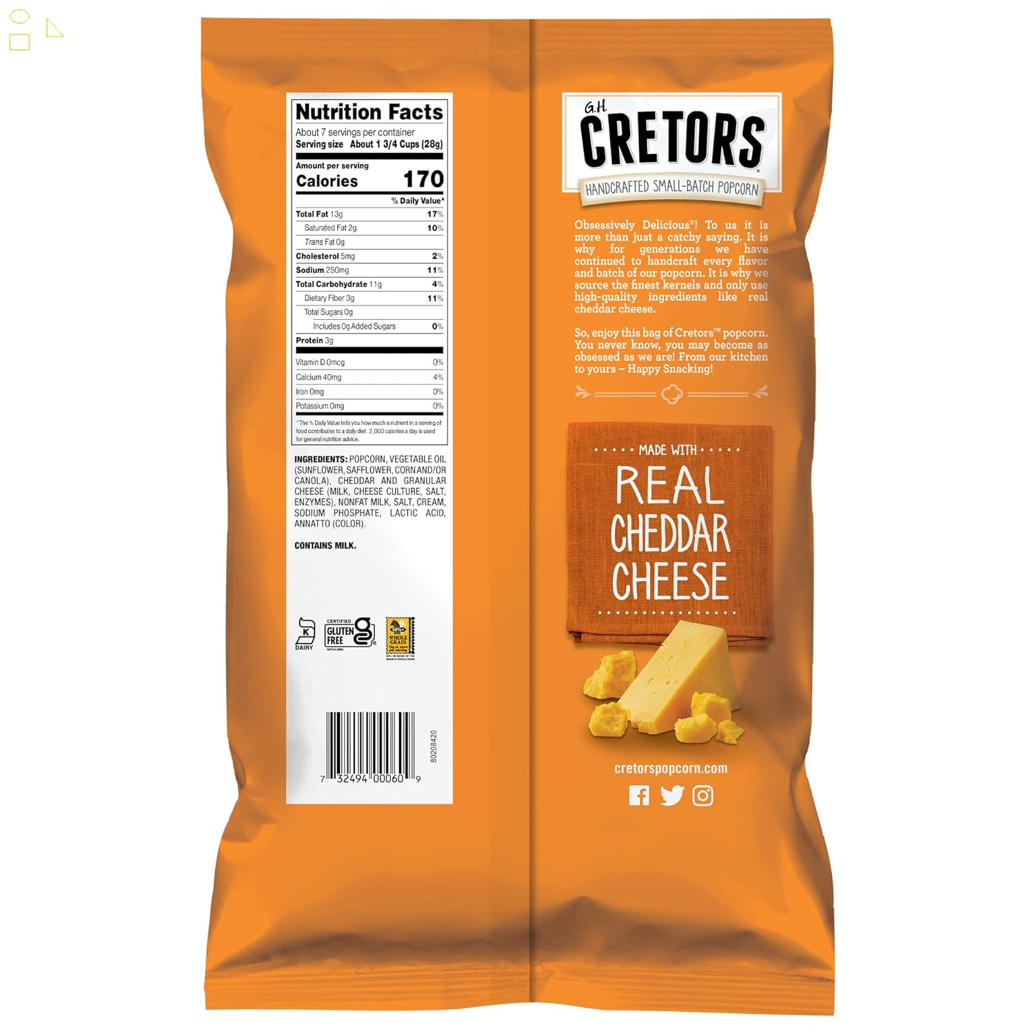 Looking for a delectable, savory snack? You've come to the right place! Cretors Cheddar Cheese is handcrafted with premium, sharp cheddar cheese over our fluffy, gourmet popcorn we know you'll love. We've perfected the art of full flavor cheese popcorn. Just trust us. From our kitchen to yours - Happy Snacking!