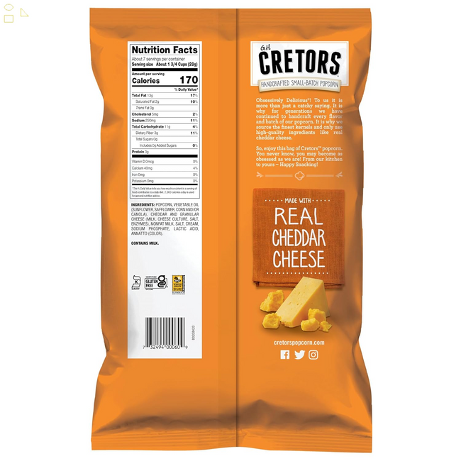 Includes Twelve (12) 6.5oz bags of Cretors Cheddar Cheese Corn Pre-popped in Waukegan, IL and Obsessively Delicious, these 6.5oz bags are perfect for your family to snack on together! Made with premium, real ingredients Our handcrafted, small-batch popcorn is certified...