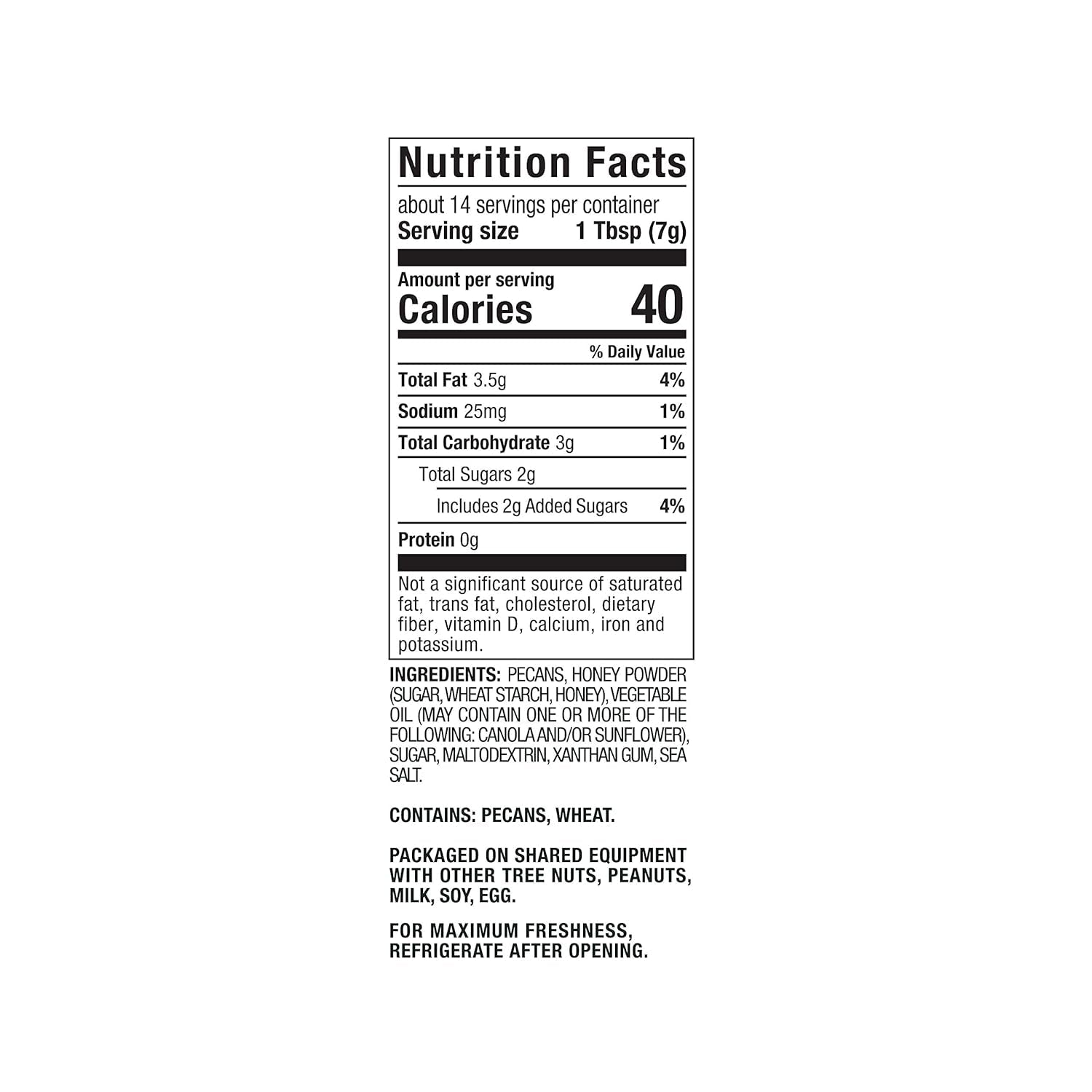 HONEY-ROASTED PECAN PIECES: Pecans lightly-roasted with honey; 3.5-oz. (Pack of 1) VEGAN-FRIENDLY SNACK & SALAD TOPPING: Sweet, crunchy and good for you, lightly-roasted, sweet Pecans make the perfect salad partner SPRINKLE, SAVOR, REPEAT: With only 40 calories per serving,honey roasted...