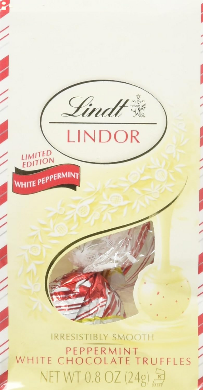 - Contains 24 - 0.8 Ounce Lindt Lindor holiday Peppermint white chocolate Truffles Mini Gift bag