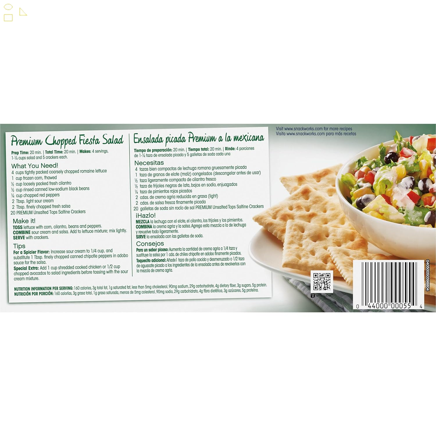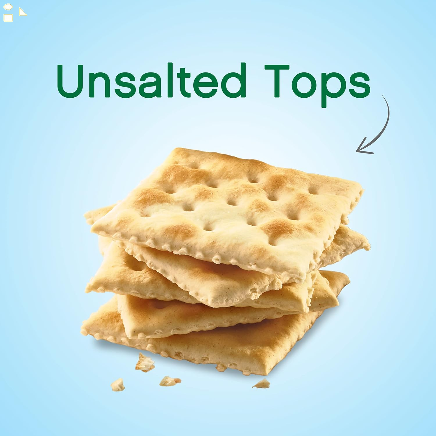 Premium Unsalted Tops Saltine Crackers have the same great taste as the originals without the salt on top. These soda crackers give you the classic light flavor and crispy texture that's a delicious complement to so many foods. Thin squares offer a versatile snack option. With no cholesterol or saturated fat, these Kosher soup crackers also add a delicious crunch to soups and stews. Snack on these crispy unsalted saltines with cheese, dips, peanut butter, or even on their own. Sealed packaging keeps the stacks of party crackers until you're ready to enjoy them.