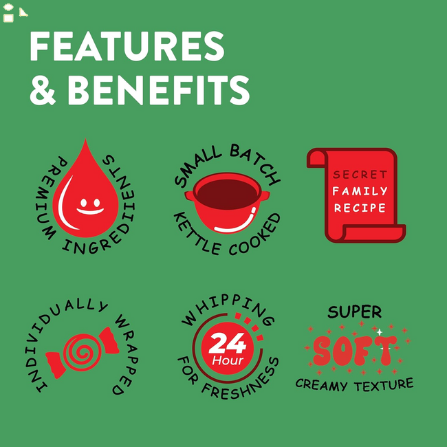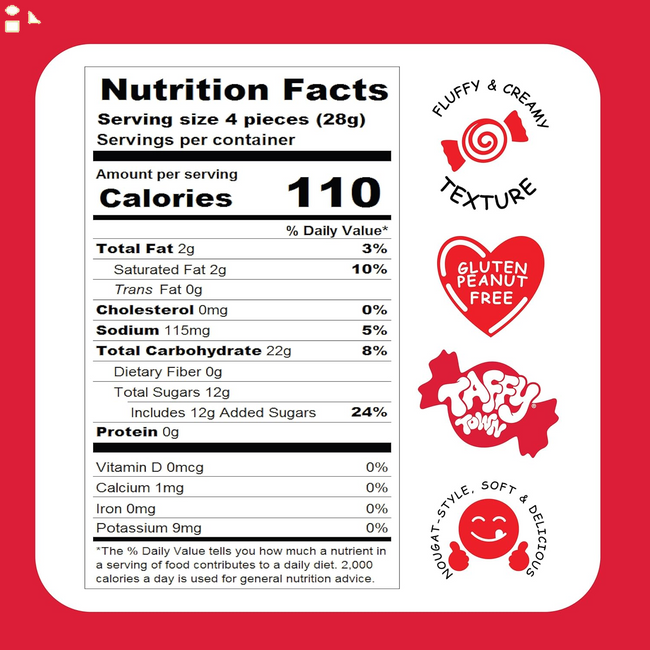 • Our unique production process of making taffy sets us apart, creating gourmet taffy that's delightfully soft and simply melts in your mouth. Known for our distinctive recipe, each piece of our taffy candy comes from a handmade batch process that ingeniously incorporates egg whites, resulting in a delightfully whipped nougat-style confection.