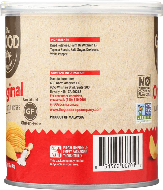 Certified gluten-free One 1.6 oz canister of The Good Crisp Company's original potato crisps Verified Non-GMO Candy Snacks