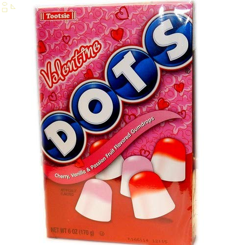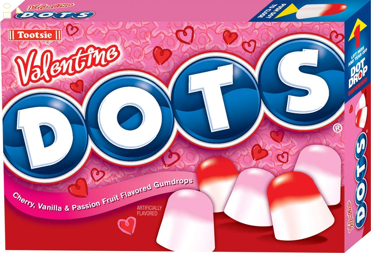- Classic chewy Dots candy featuring Valentine colors of red, white, and pink with fun flavors of Cherry, Vanilla, and Passion Fruit.