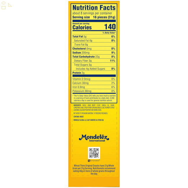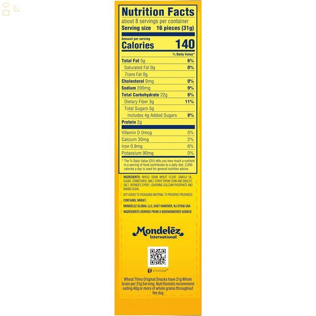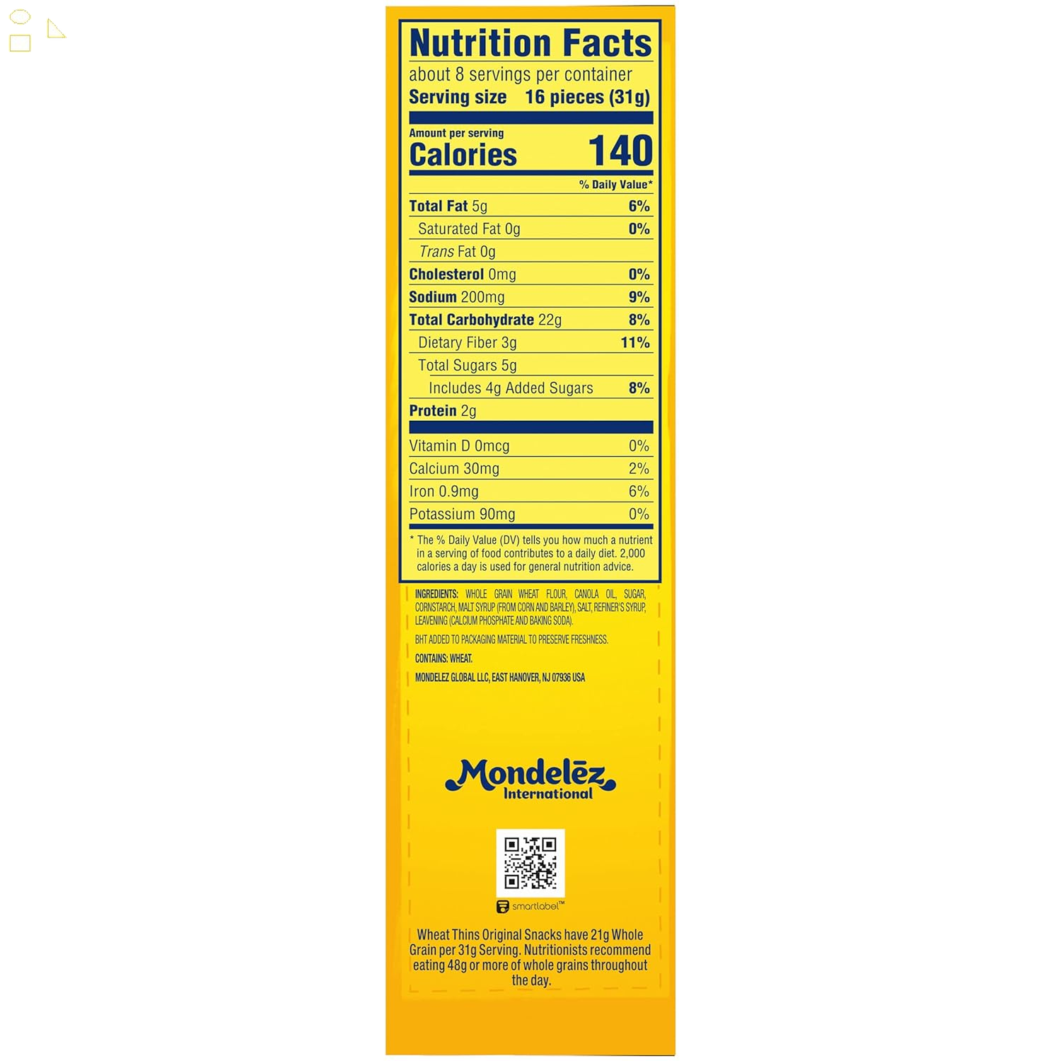 One 8.5 oz box of Wheat Thins Original Whole Grain Wheat Crackers (packaging may vary) Nutty, whole grain flavor gives these snack crackers a salty-sweet taste Each serving has 21 g of whole grains, and no cholesterol, high fructose corn...