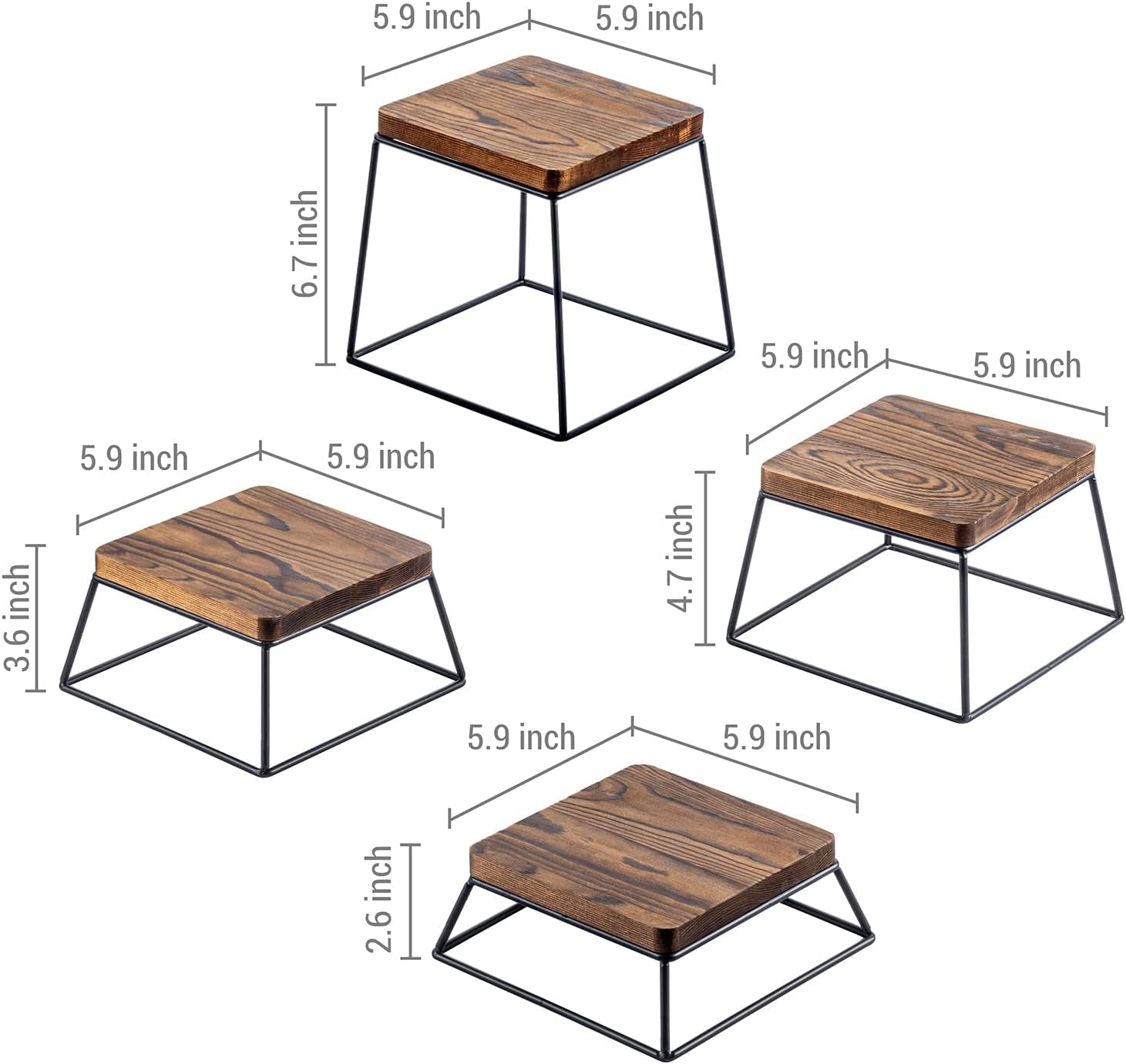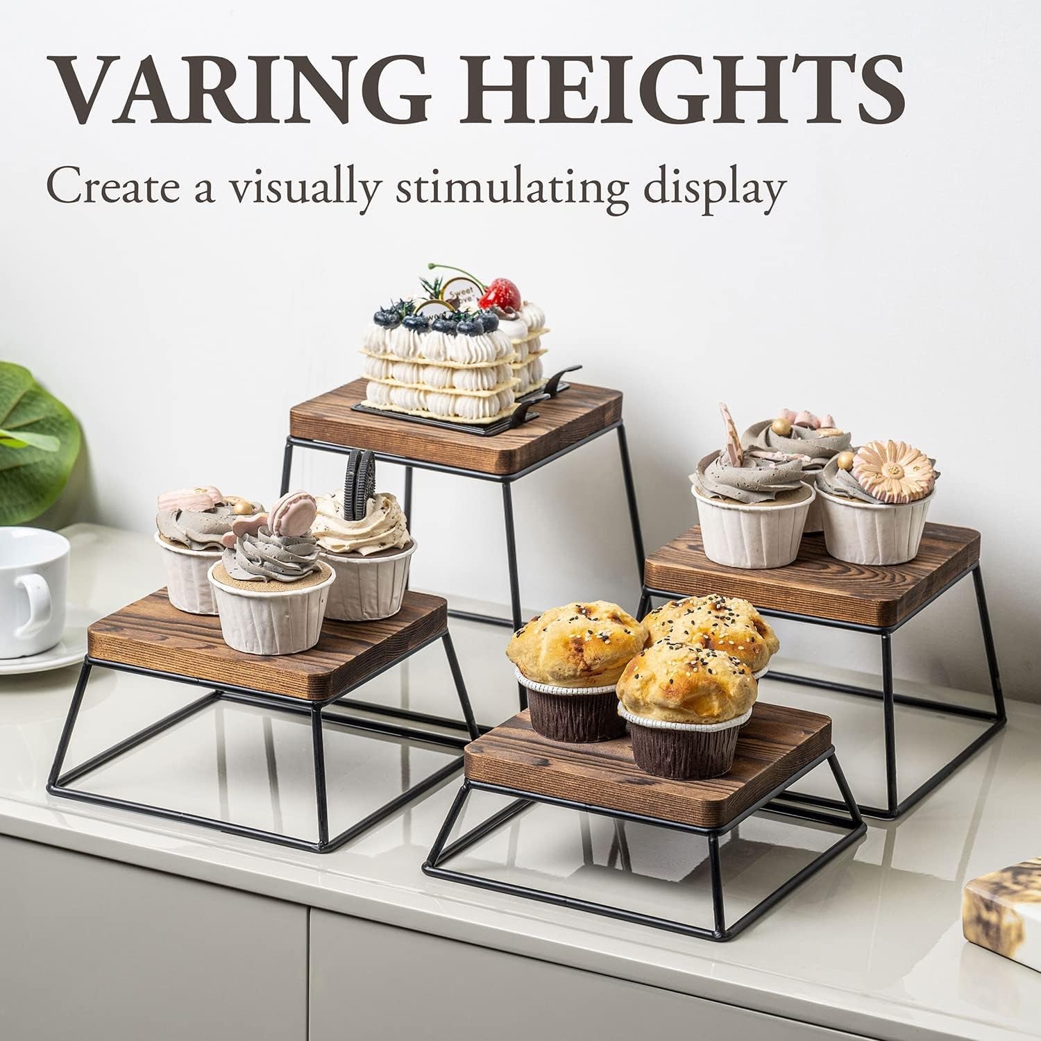 Set of 4 burnt wood and black metal wire small food display riser stands Perfect for displaying appetizers, desserts, petit fours, cupcakes, muffins, and other small food items in your home, restaurant, café or bakery Each stand is displayed at...