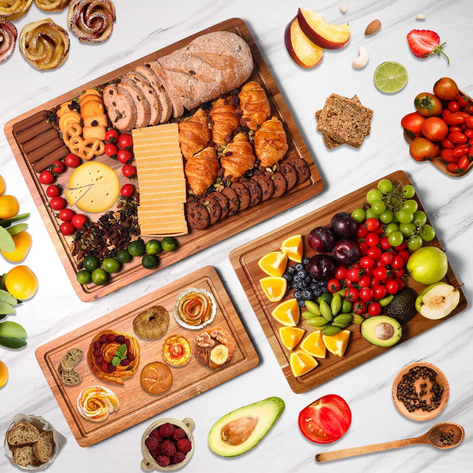 - MULTIFUNCTIONAL CUTTING BOARDS SET - This set of cutting board has 3 sizes, 17x12 inches for cutting meat or steak, 12x10 inches for cutting vegetables, 12x7 inches for cutting fruits and bread, etc. The 3 sizes of wooden cutting board can meet your regular cutting needs. And it can also be used as a serving tray for guests.
