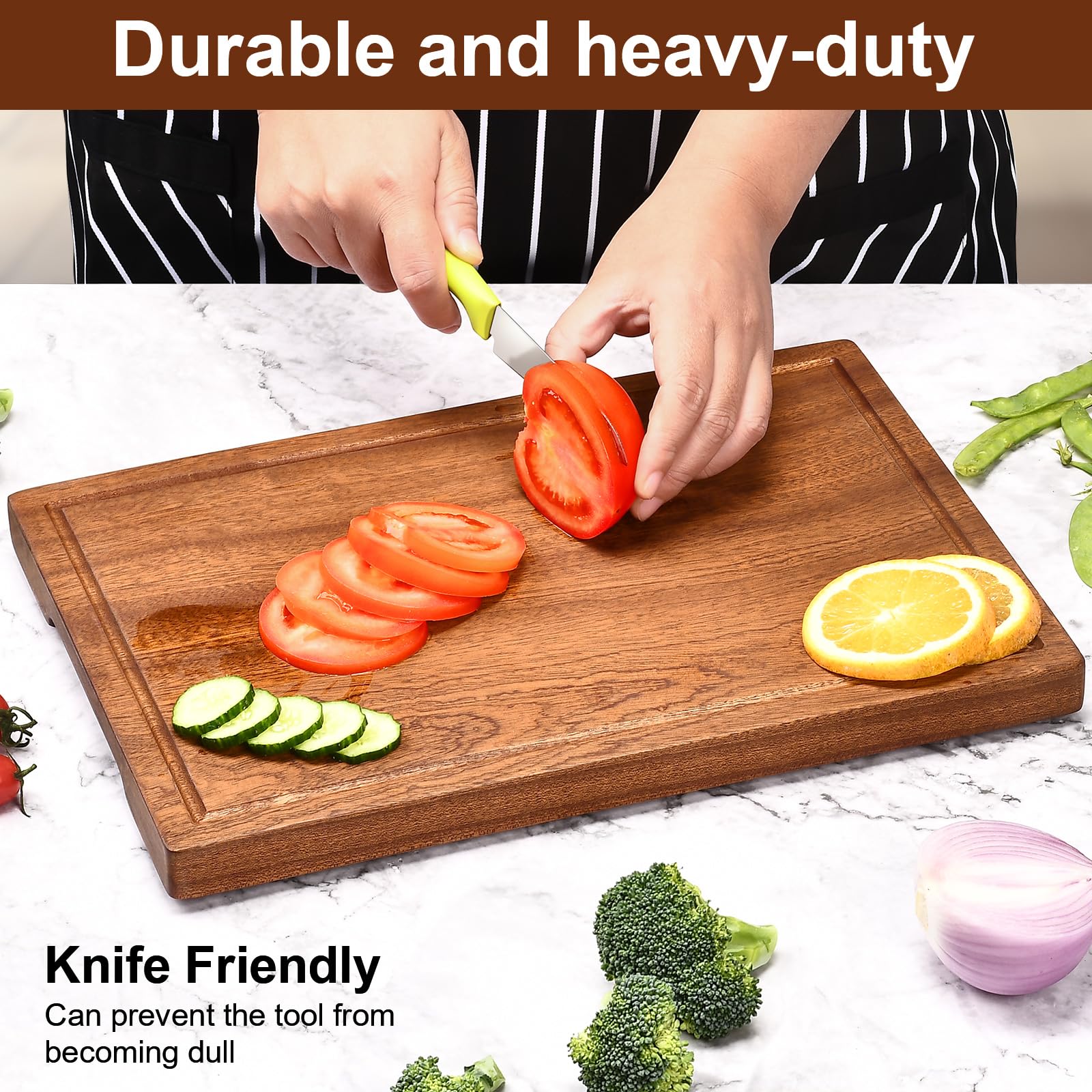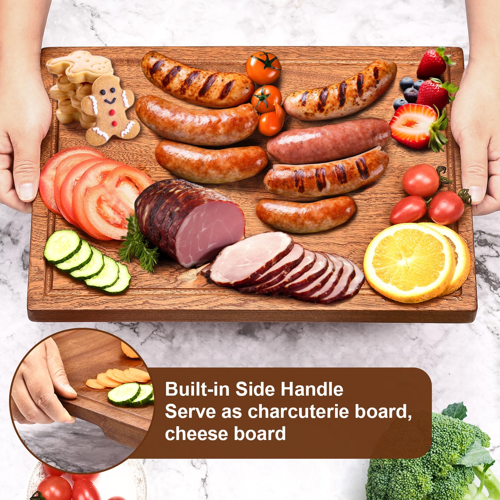 - 【Knife Friendly Surface】: Our wooden chopping board with a Built-in handle is thickened to make it more durable and less likely to warp or damage your knives. The surface is polished to increase its strength, and high density does not hurt the knife, so your knives stay sharp for a long time. This wood cutting board for the kitchen is a great helper, perfect for chopping, slicing, barbeque carving, and butcher block. It would also make a great gift for your parents or friends.