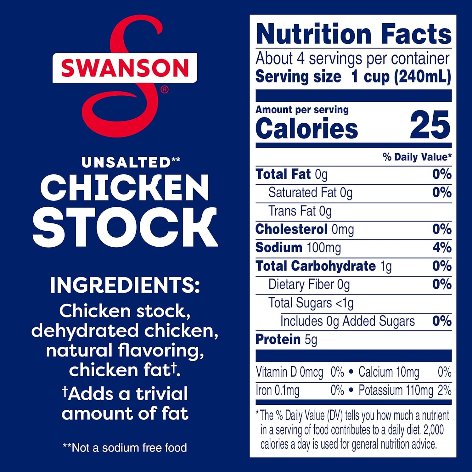 - One 32 ounce recyclable carton of 100% Natural Unsalted (1) Chicken Stock [(1) Not a sodium free food]
