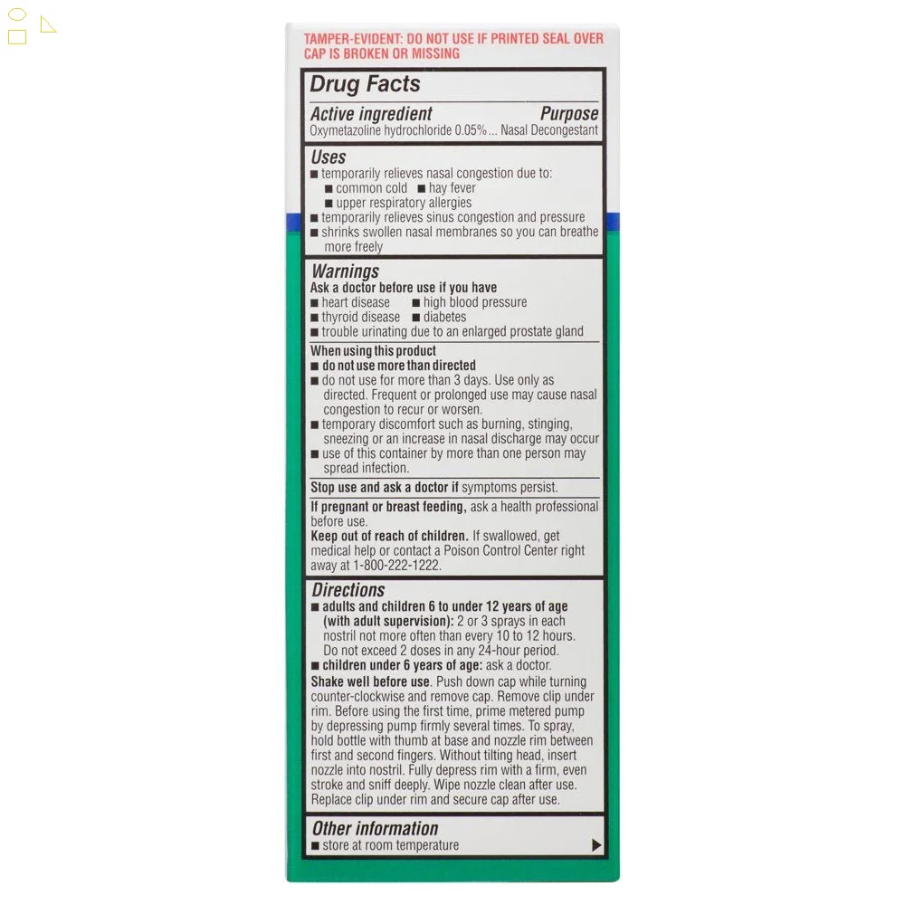 - Active ingredient (in each dose): Oxymetazoline HCl 0.05% (nasal decongestant)