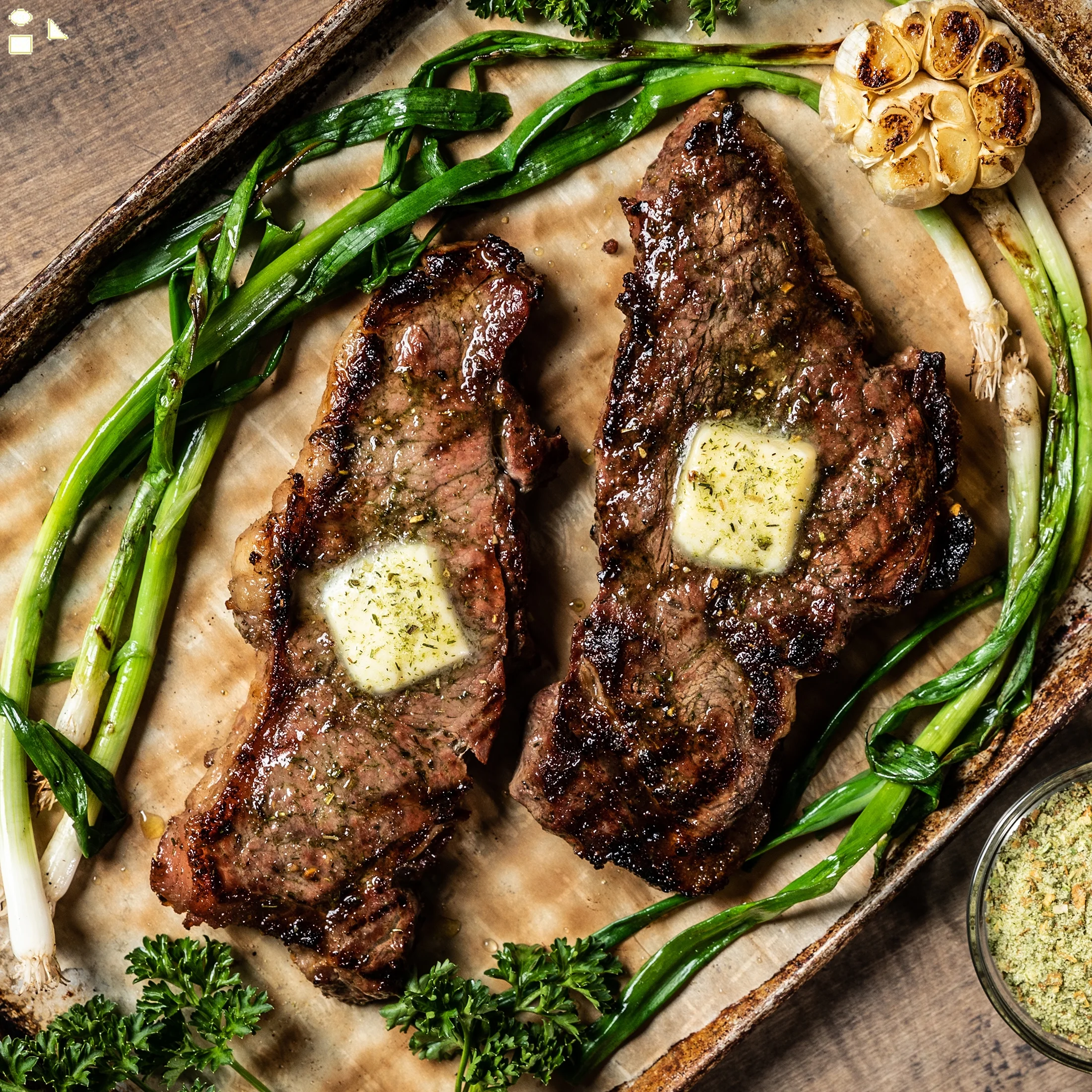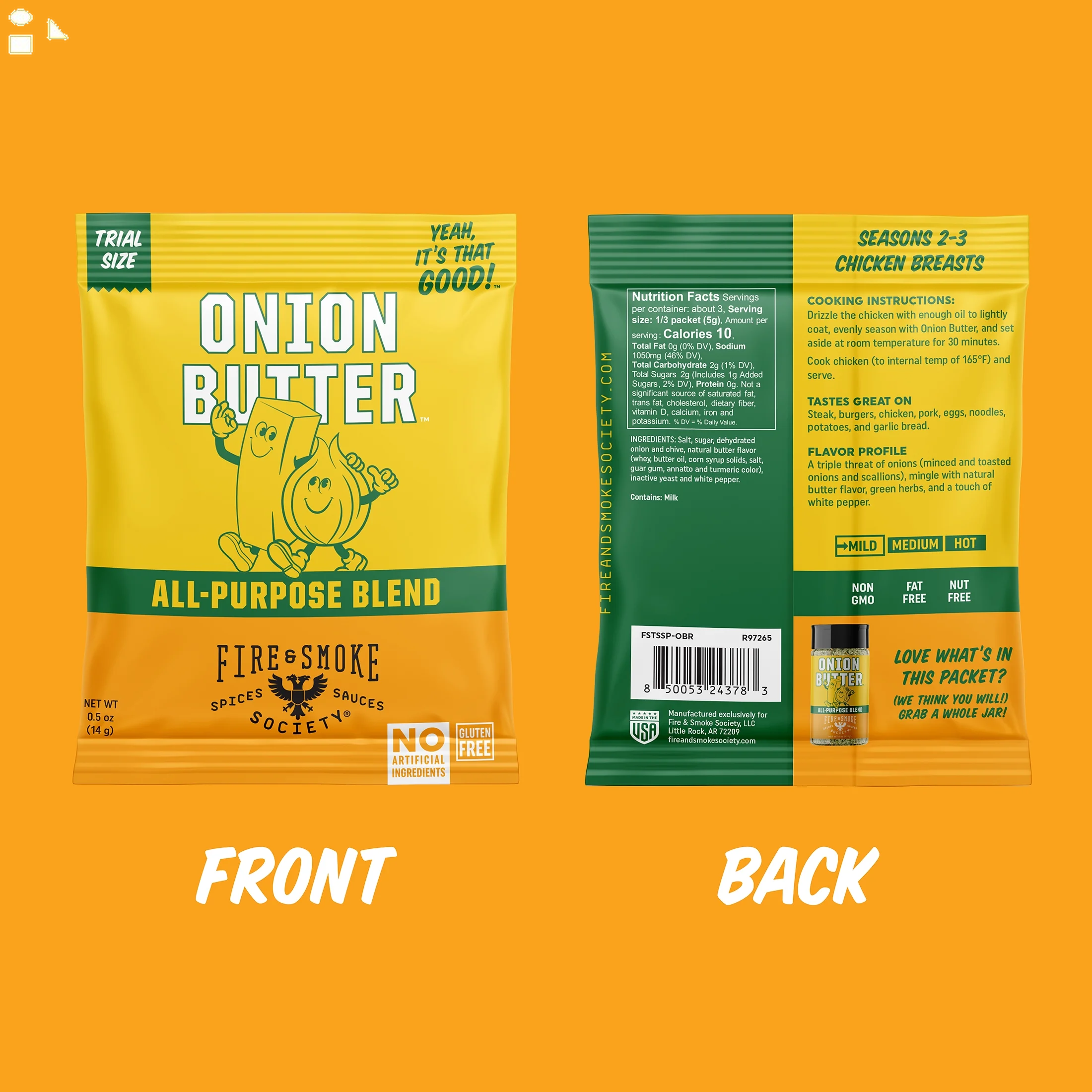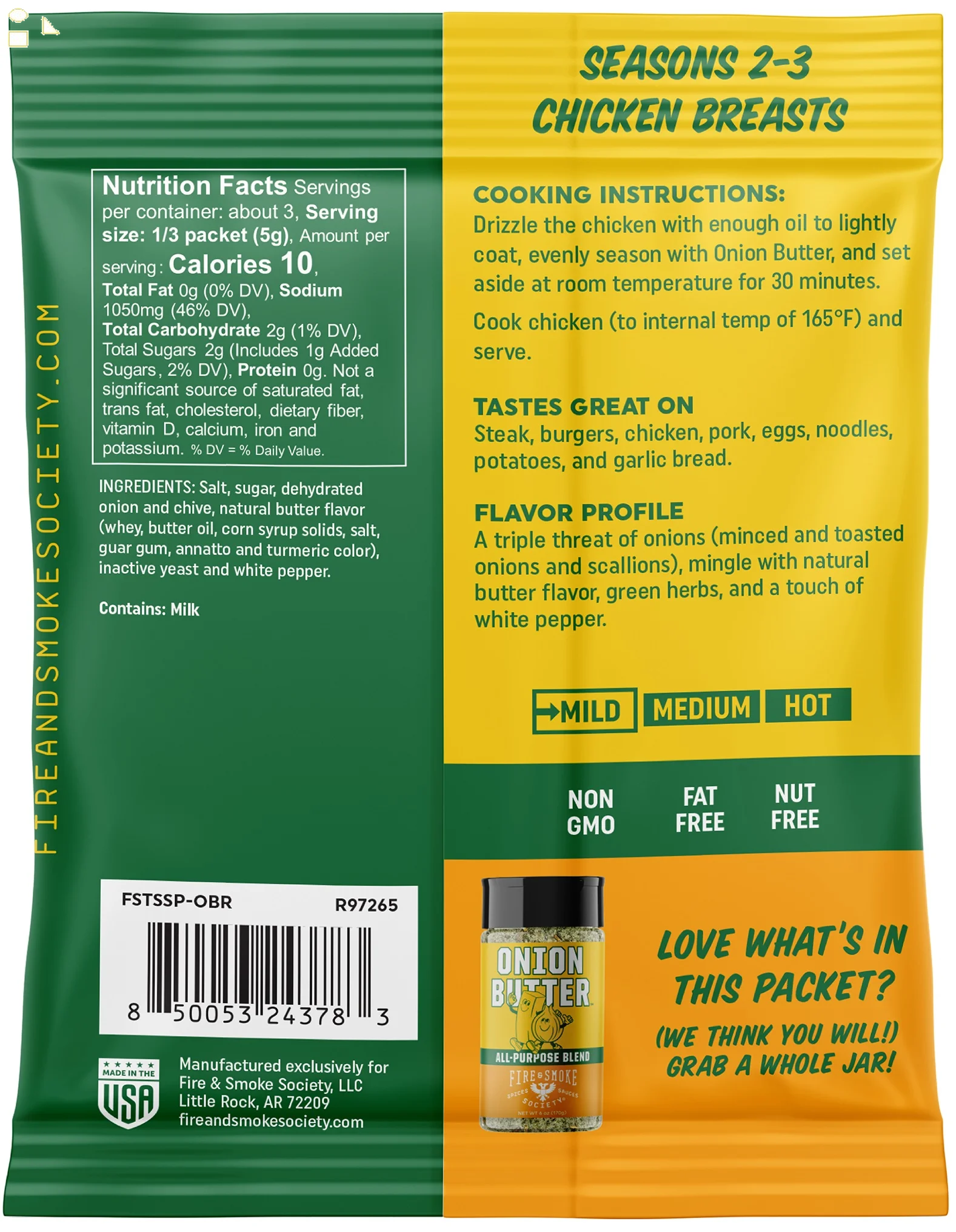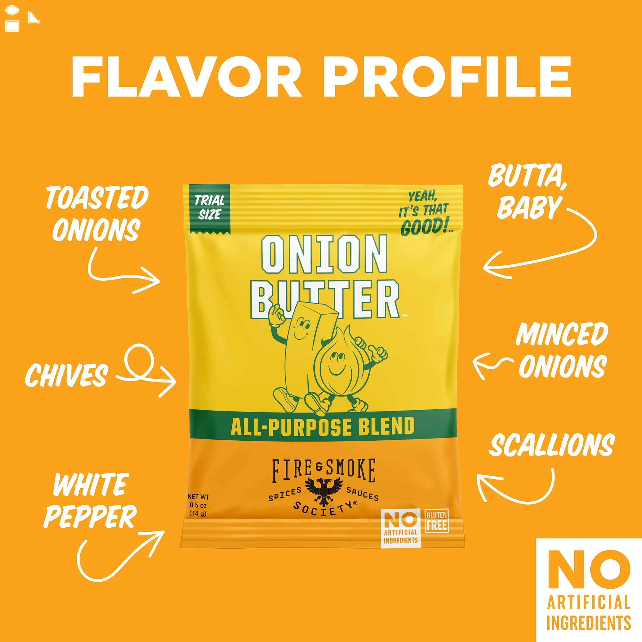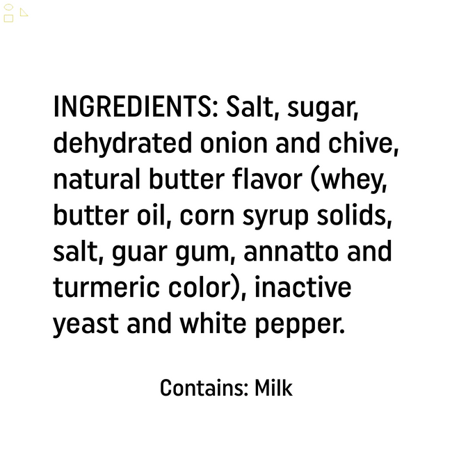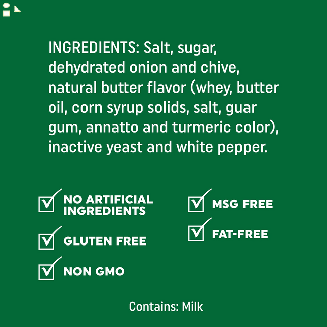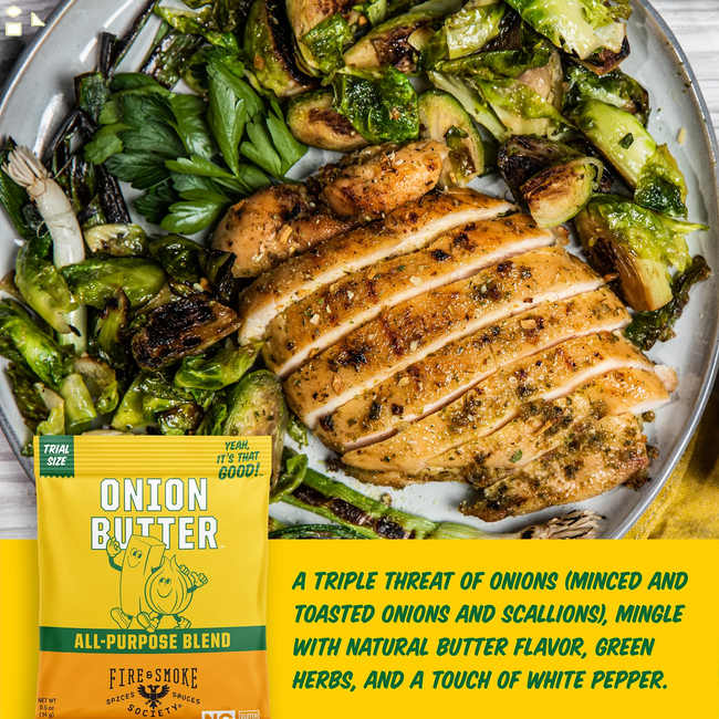 - Our Onion Butter seasoning mix is the perfect blend of salt, cane sugar and four alliums (toasted onion, shallots, scallions, chives), nutritional yeast, natural butter flavor and white pepper. Use it as a steak seasoning, steak rub, on chicken thighs, turkey wings, rotisserie chicken, in pork rubs, eggs, noodles, burger seasoning, potato seasoning, french fry seasoning and (duh!) garlic bread. No Artificial Ingredients, Gluten Free, Non GMO, MSG Free, Fat-Free