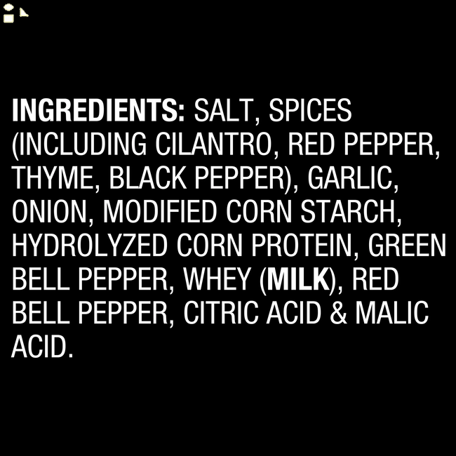 - Features salt, cilantro, red and black pepper, thyme, garlic and onion