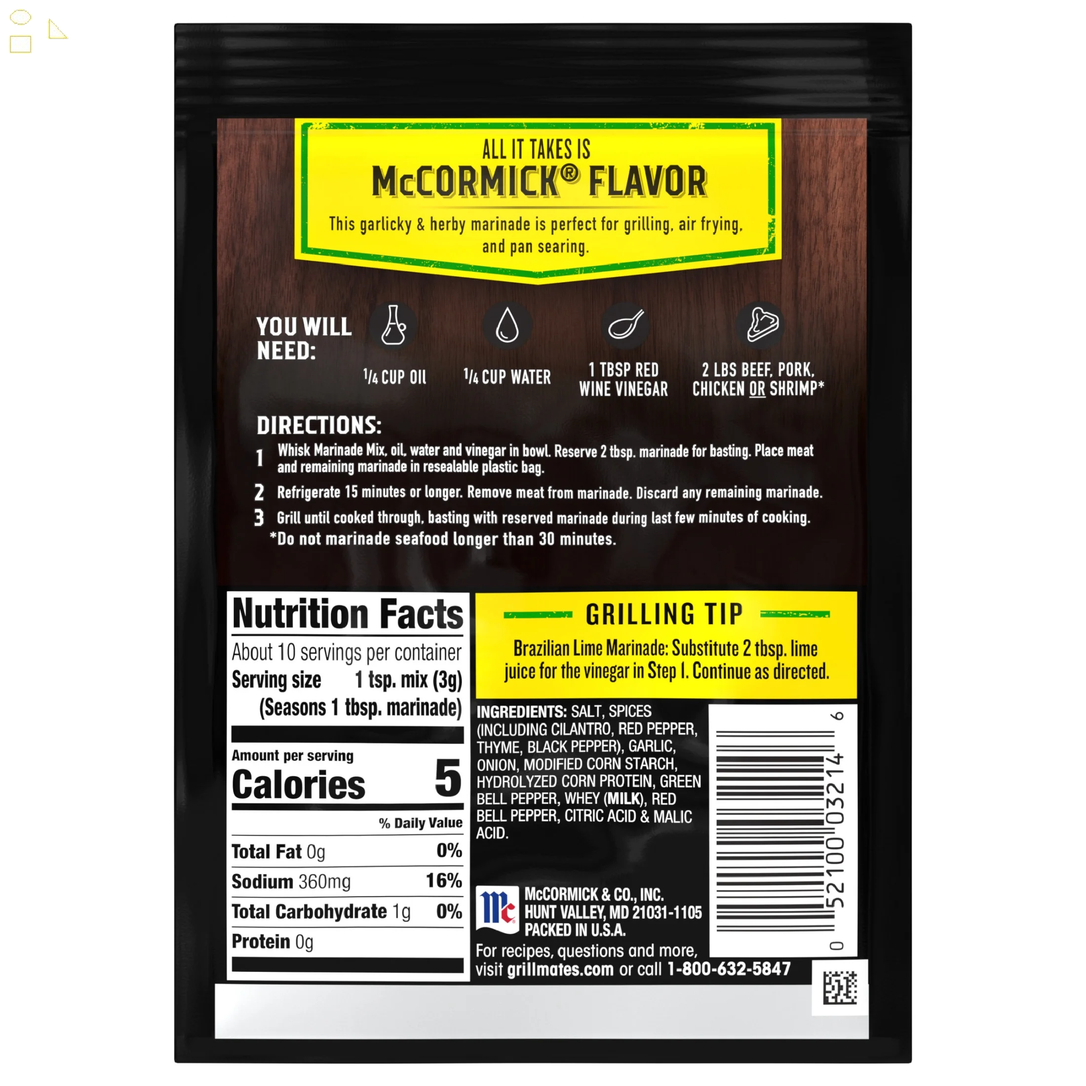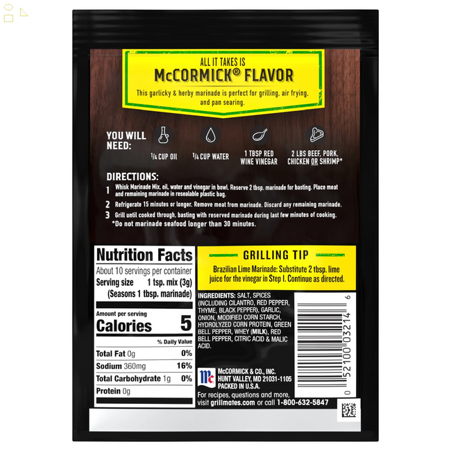 - McCormick Grill Mates Gluten Free Brazilian Steakhouse Marinade, 1.06 oz Envelope