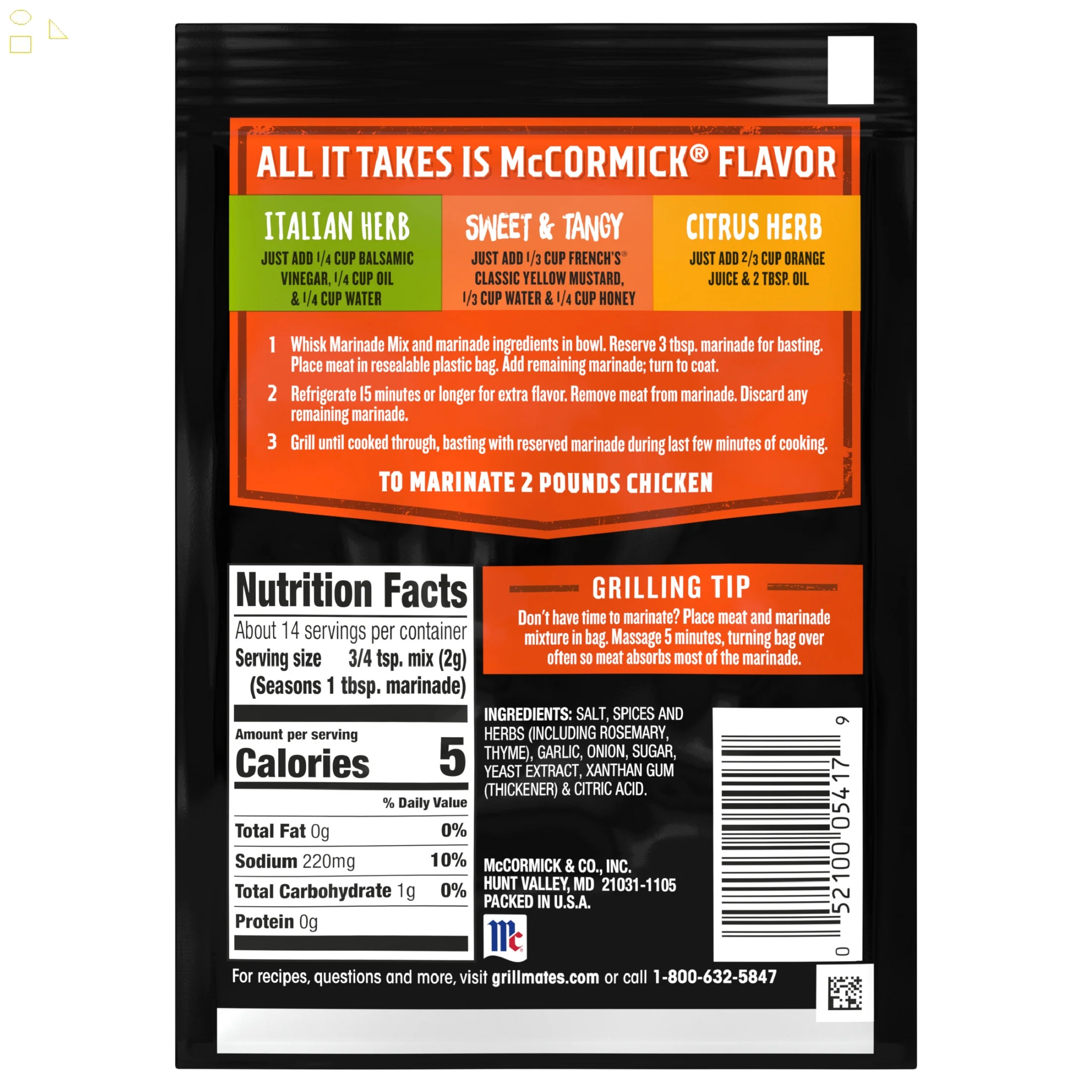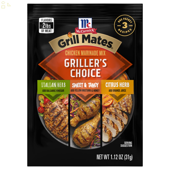 McCormick Grill Mates Gluten Free Griller's Choice Chicken Marinade Mix, 1.12 oz Envelope. McCormick Grill Mates Griller’s Choice Marinade pouches allow grillers to flavor meat their way. With the Chicken Grilling Marinade, you can opt for the taste of Italian Herb, Sweet & Tangy or Citrus Herb by whisking in a different add-in ingredient.This McCormick Grill Mates Marinade Mix offers the ultimate in flavor choices. For Italian Herb marinade, add balsamic vinegar; for Sweet & Tangy marinade, add yellow mustard (we recommend French’s) and honey; for Citrus Herb marinade, add orange juice. Marinate 2 lbs. poultry for 30 minutes then grill for a chicken dinner with winning flavor. Our grilling marinade mixes are expertly blended with McCormick spices & herbs to elevate your backyard barbecues. For beef, check out Griller’s Choice Beef Marinade Mix. This McCormick Grill Mates Griller's Choice Chicken Marinade Mix is in a Plastic packet that is 1.12 ounces. Store this shelf-stable item at an ambient temperature.