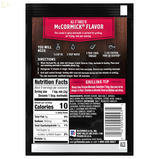 McCormick Grill Mates Gluten Free Honey Sriracha, 1 oz Envelope. Bring on the heat! Our marinade mix combines the tangy heat of Sriracha with sweet honey and brown sugar. A trend-setting flavor, Sriracha adds stand-out taste to your grilled chicken, pork or seafood. Sriracha is a spicy Southeast Asian condiment of chili peppers, vinegar and garlic that’s typically served with noodles, seafood and spring rolls. This awesome sauce is so popular that it now flavors everything from potato chips to pizza and fried chicken. Our marinade mix balances the tangy heat of Sriracha with honey and brown sugar. Step up your grilling game by using it to marinate chicken wings, shrimp, pork tenderloin or ribs. It’s an enticing fusion of fiery heat and sweet tanginess that will have them coming back for more! This McCormick Grill Mates Honey Sriracha is in a Paper packet that is 1 ounces. Store this shelf-stable item at an ambient temperature.