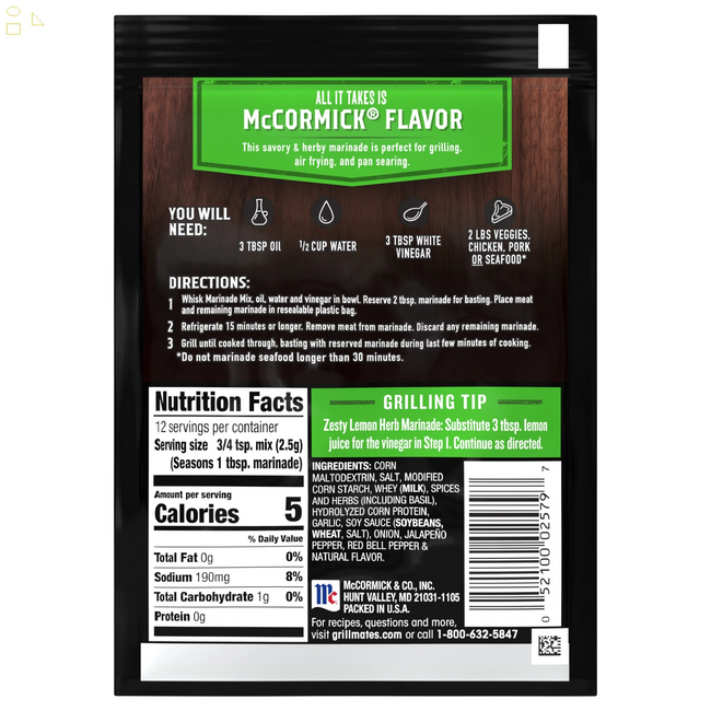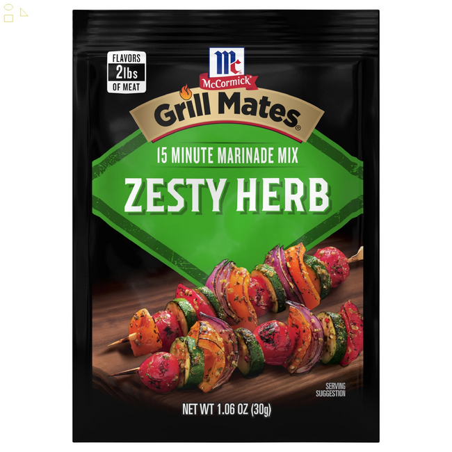 McCormick Grill Mates Zesty Herb Marinade Seasoning Mix, 1.06 oz Envelope. McCormick Grill Mates Zesty Herb Marinade Seasoning Mix makes backyard barbecues memorable with a classically delicious blend of basil, garlic, onion and jalapeno peppers. It’s perfect for all that you’re grilling this summer, including pork, chicken, shrimp and vegetables. Crafted with McCormick herbs and spices, our marinade mix adds the zesty flavor that makes everything tastier and juicier. So versatile, it’s more than just a marinade mix. Try mixing with ground beef for savory burgers. Or, use as a simple, yet flavorful rub, on meat before grilling. For the best ever summer veggies, prepare the mix as a marinade, toss with tomatoes, zucchini and bell peppers then grill. Serve as a side or topping for pizza, bruschetta or salads. This McCormick Grill Mates Zesty Herb Marinade Seasoning Mix is in a Plastic packet that is 1.06 ounces. Store this shelf-stable item at an ambient temperature.