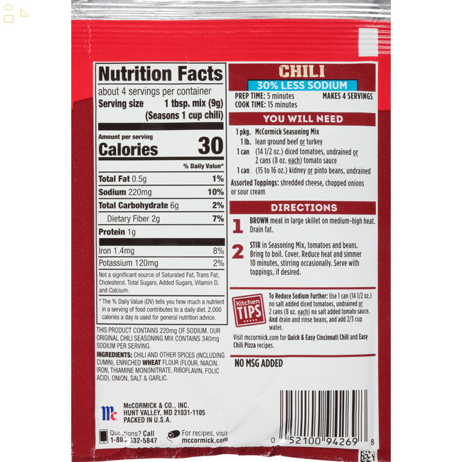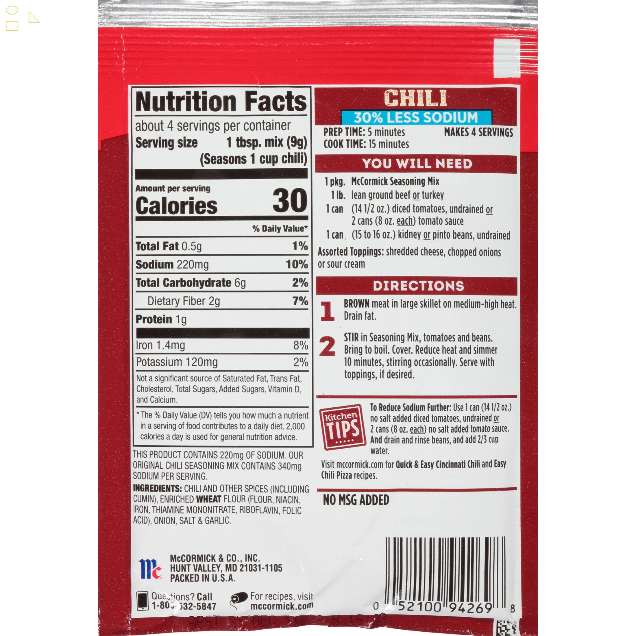 McCormick Less Sodium Chili Seasoning Mix, 1.25 oz Envelope. What's McCormick 30% Less Sodium Chili Seasoning Mix all about? Great tasting chili with less sodium! With 30% less sodium and no added MSG or artificial flavors, you can feel good about serving your family the best. It's blended with McCormick spices, including chili pepper, onion and garlic. Mix with your favorite beef or turkey chili recipe for a quick weeknight meal that will have the whole table craving seconds. This McCormick Less Sodium Chili Seasoning Mix is in a Paper packet that is 1.25 ounces. Store this shelf-stable item at an ambient temperature.