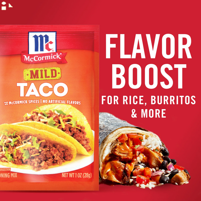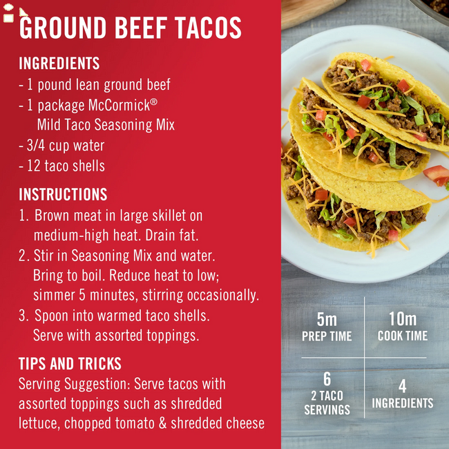 McCormick Mild Taco Seasoning Mix, 1 oz Envelope. With McCormick Mild Taco Seasoning Mix, the whole family will wish taco night could be every night! Our signature blend adds vibrant flavor with a mild heat to everything from tacos to nachos, taco casserole, chicken wings, and more. Made with ingredients including paprika, chili pepper, cumin, and onion, mild taco seasoning mix is the perfect addition to your pantry. Our 1 oz packet includes enough seasoning mix to flavor 1 lb of ground beef or ground turkey for delicious tacos that are ready to serve in just 15 minutes! Made with no MSG added, no dairy ingredients, and no artificial flavors, McCormick taco seasoning mix is full of flavor you can trust. It’s made for every kind of taco out there – chicken tacos, beef tacos, vegetarian tacos, shrimp tacos … but it’s also versatile enough for use in casseroles, burgers and adding it’s south-of-the-border zip to fajitas or quesadillas. Wondering how to make homemade tacos? Brown meat in a large skillet on medium-high heat. Drain the fat and stir in seasoning mix and water. Bring to a boil before reducing heat and simmering for five minutes, stirring occasionally. Spoon into warm taco shells and enjoy with your favorite taco toppings. This McCormick Mild Taco Seasoning Mix is in a Paper packet that is 1 ounces. Store this shelf-stable item at an ambient temperature.