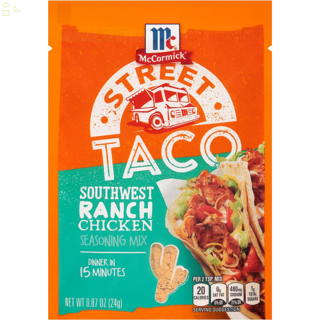 Tangy ranch flavor with a hint of garlic is everything homemade chicken tacos need. Made with McCormick Street Taco Southwest Ranch Chicken Seasoning Mix, a delicious family-style dinner can be on the table in 15 minutes. No food truck hunt required. Give Taco Tuesday a makeover with the craveworthy taste of ranch and a southwestern kick! It’s the perfect flavor boost for taco night. Combine with chicken strips in a skillet and serve in warm tortillas with your favorite toppers, like shredded lettuce, Mexican cheese, chopped tomatoes, avocado and cilantro. Best of all, dinner is ready in 15 minutes for the whole family to enjoy.