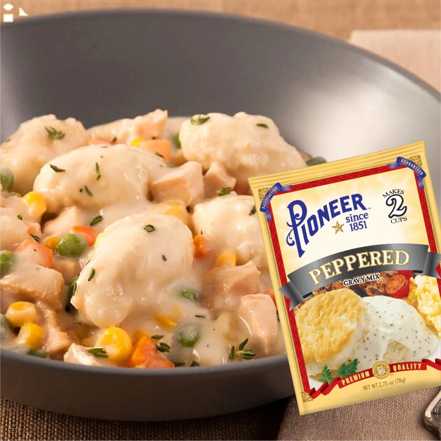 - Pioneer Peppered Gravy Mix can be used to Top Biscuits, Country Fried Steak, Mash Potatoes and More
