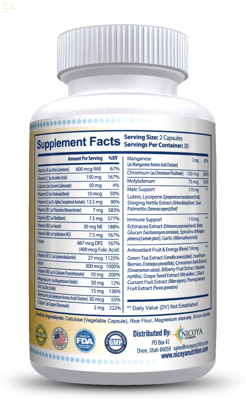 - ✔️LETHARGIC? LOW MOTIVATION? UNSATISFACTORY HEALTH? - Nicoya Nutrition's daily multivitamin supplement may have you feeling active and more energized* with this perfectly combination of vitamins and minerals; blended to naturally enhance energy levels and improves overall mood*, support the immune system*, and provide additional prostate support to urinary function.
