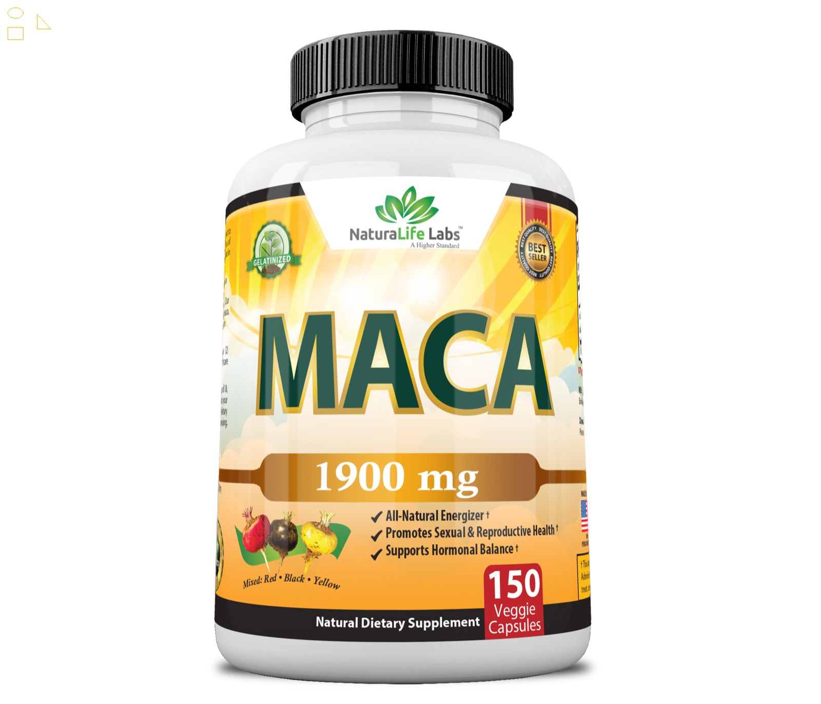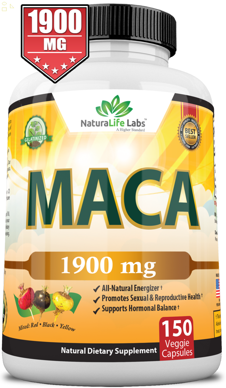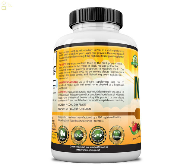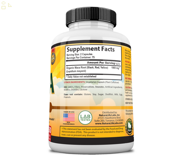 NaturaLife Labs Organic Maca Delivers 950mg per vegan capsule 100% Pure High Quality Peruvian Organic Maca. This product contains 3 types of Maca Black, Red and Yellow which combined which provide enhanced benefits. Maca Root is best known for promoting fertility, boosting libido and stamina. Yellow Maca Black MacaRed MacaOur Organic Maca is:100% Pure Vegan Peruvian MacaNo fillers, binders or artificial ingredientsFree of: yeast, wheat, soy, dairy, gluten, preservatives.NaturaLife Labs products are manufactured in accordance with Good Manufacturing Practices (GMP).