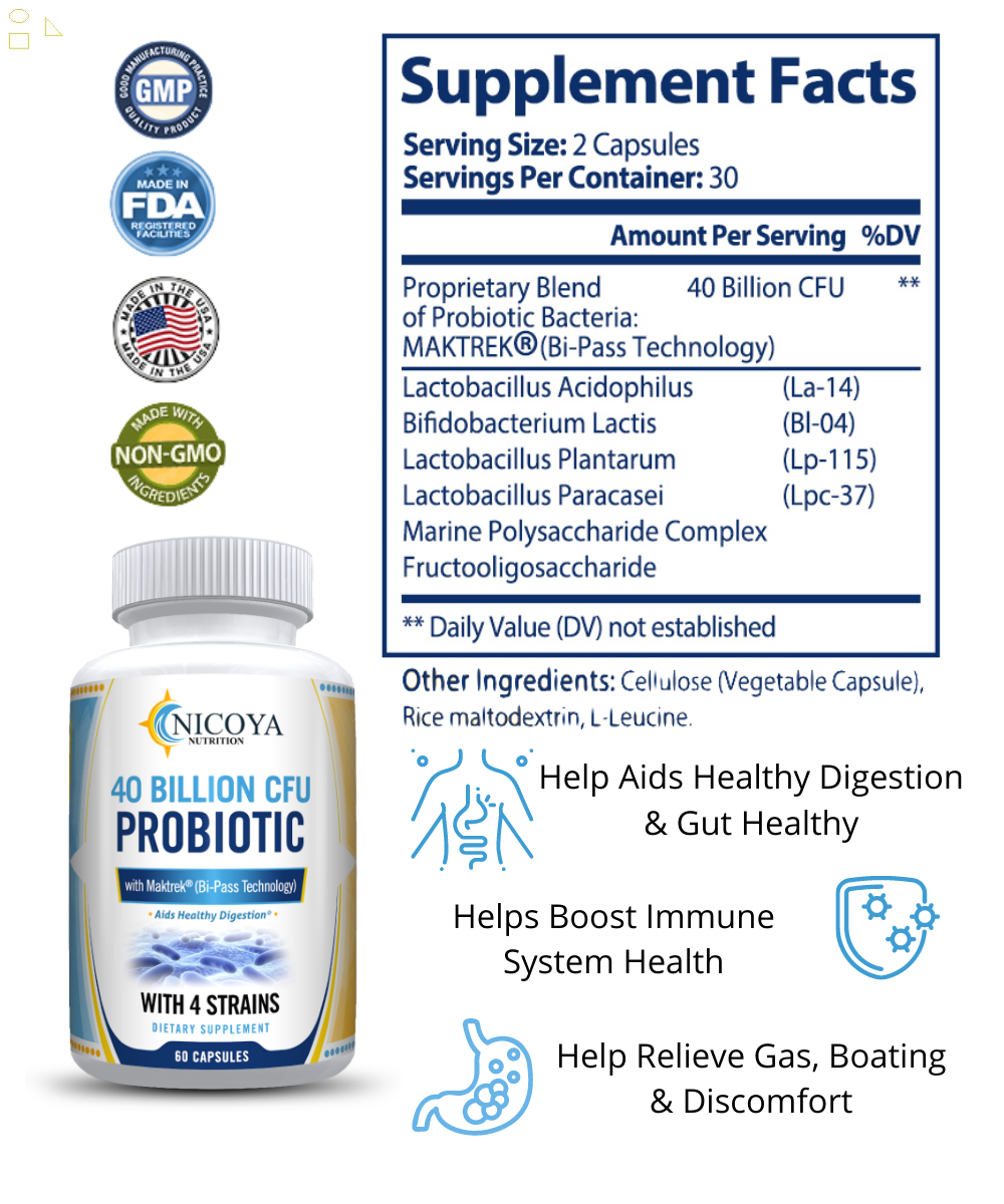 Our all-natural, non-GMO, gluten-free Probiotic 40 Billion CFU supplement contains 6 different types of healthy bacteria chosen to support your gut health. Your gut health has a crucial impact on many areas of your health from your weight to your immune system. Your gut health can also impact your appetite, cravings and even your mental health. A big part of your digestive health is having a thriving microbiome with lots of healthy gut bacteria. Nicoya Nutrition’ Probiotic 40 Billion CFU supplement can help give your microbiome a boost by directly delivering probiotics where they need to be in order to thrive. Some probiotics dissolve in the stomach before the bacteria can reach their final destination. We use MAKTrek technology to make sure you get the best results. Rest assured that all of our supplements are manufactured in the United States and third party tested for your peace of mind.
