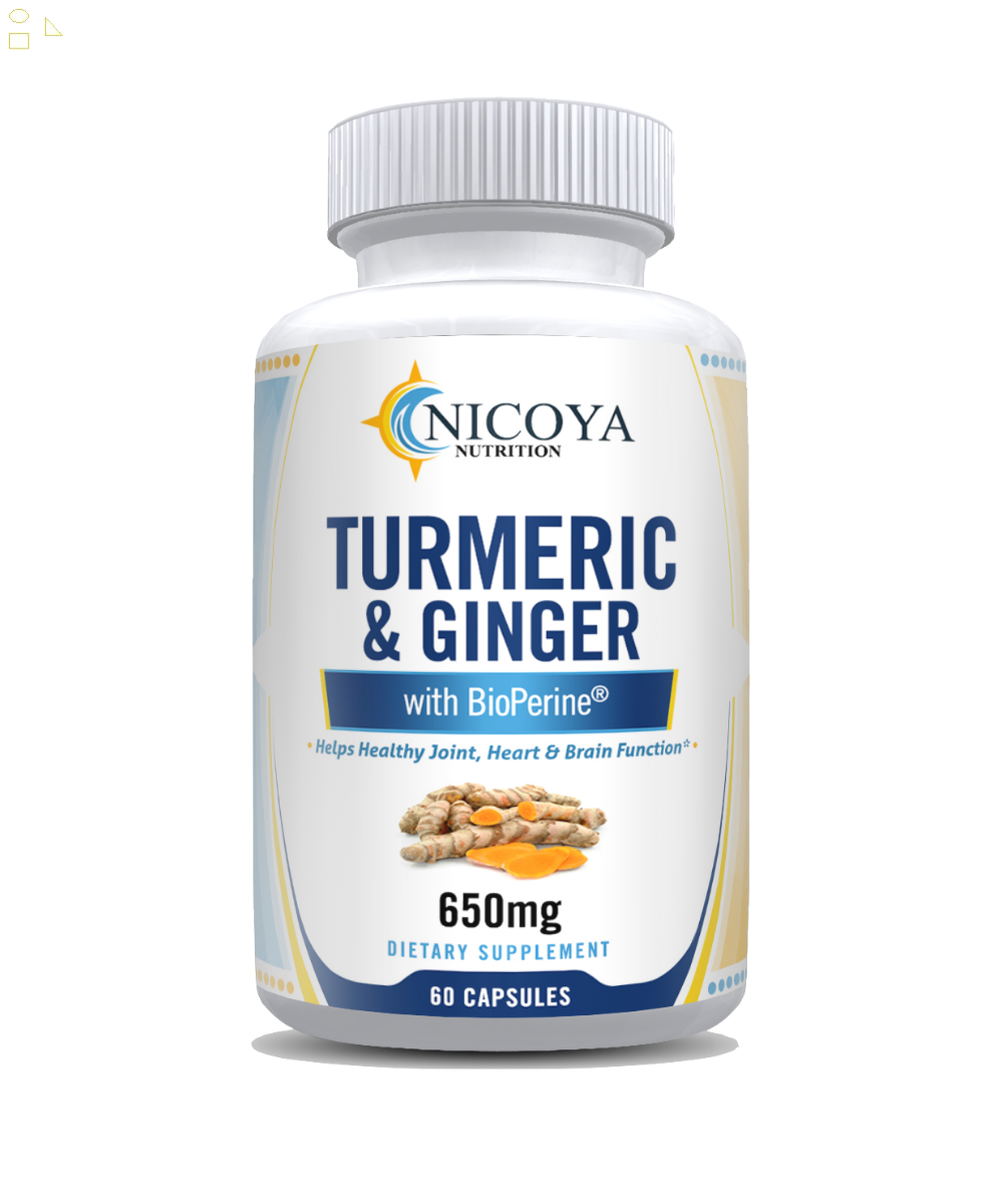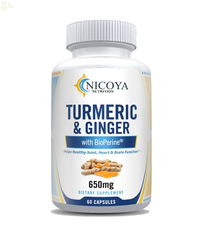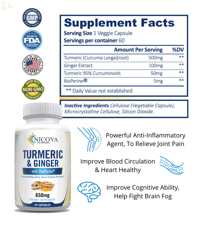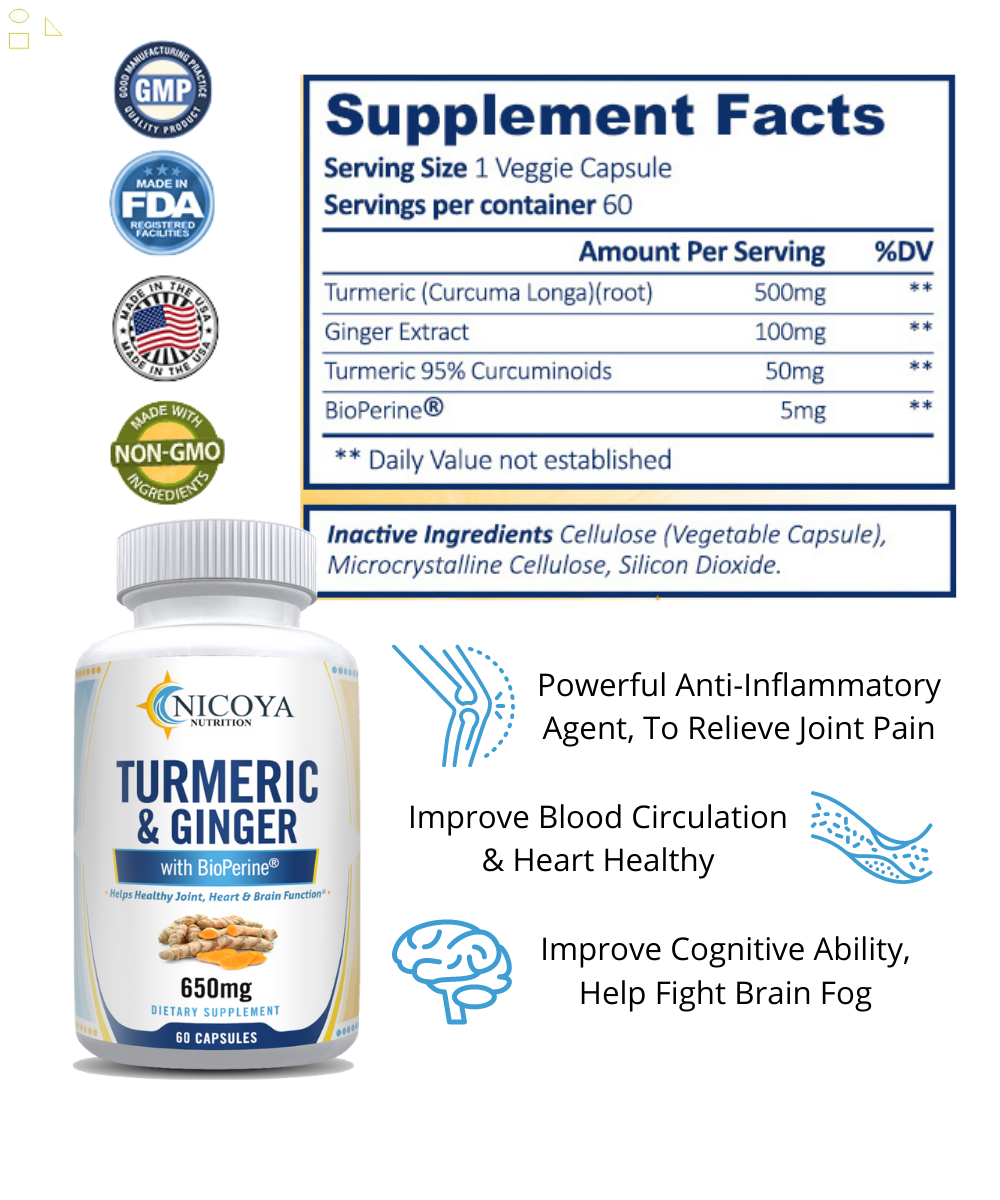 Organic Turmeric (Curcuma Longa)(root), Organic Ginger Extract, Turmeric 95% Curcuminoids, Bioperine (Black Pepper Extract), Cellulose (Veggie Cap), Magnesium Stearate.