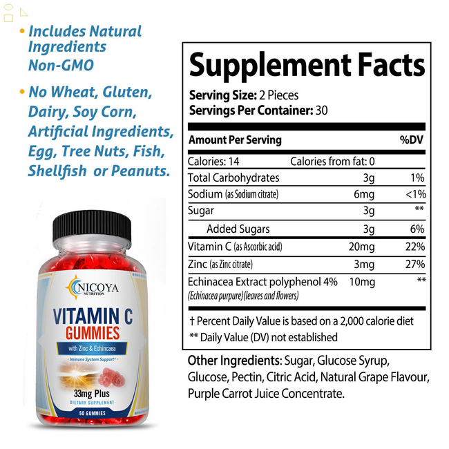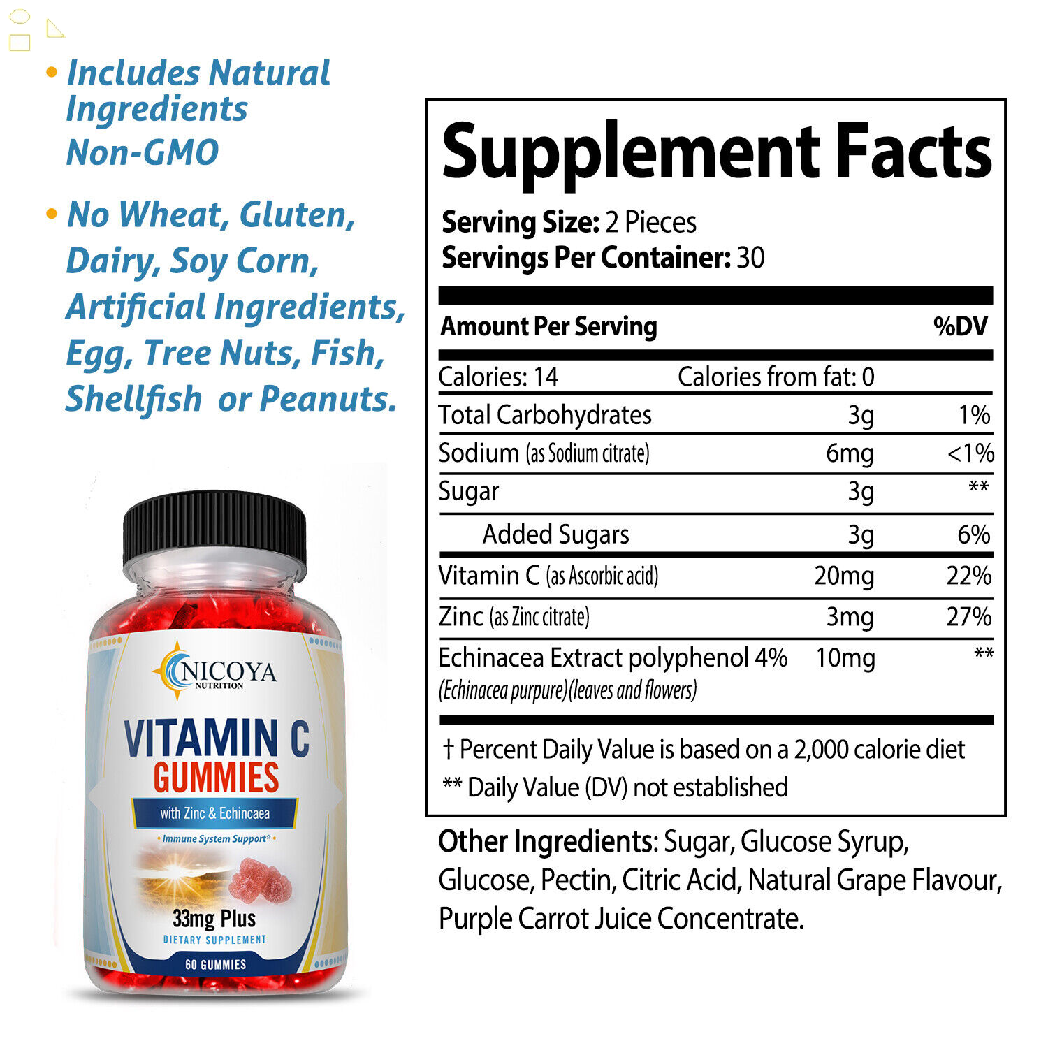 • 3-in-1 IMMUNE SUPPORT: Nicoya Nutrition's Vitamin C Gummies have been carefully formulated with a potent combination of Vitamin C, Echinacea, and Zinc for robust immune system support