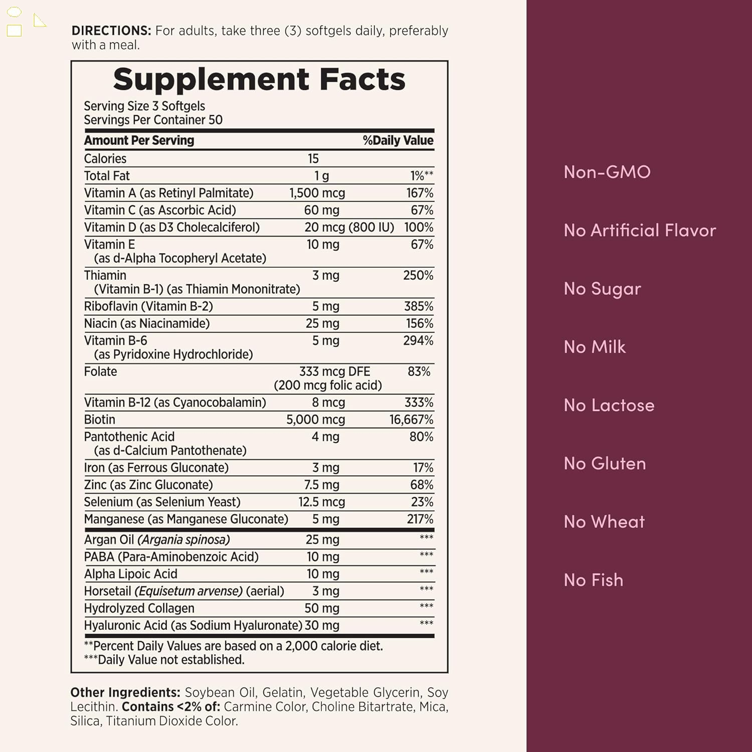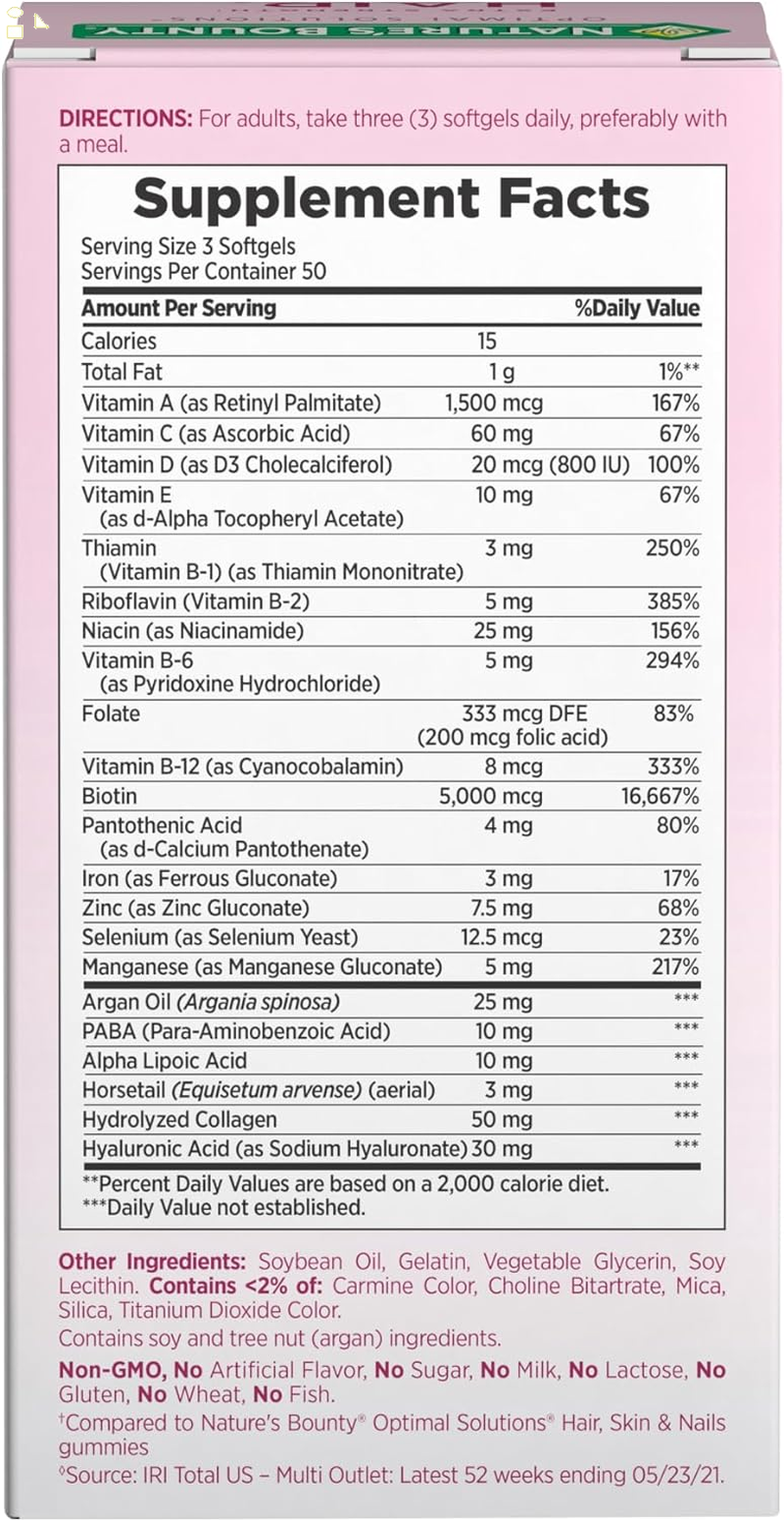 From the #1 for hair, skin, and nails,(2) Nature's Bounty Extra Strength Hair, Skin & Nails Rapid Release Softgels are packed with biotin and contain antioxidant vitamins C & E plus hyaluronic acid and vital nutrients to support beautiful hair, glowing skin, and healthy nails from the inside, out.(1) Each serving of our softgels contains antioxidant vitamins A, C & E plus hyaluronic acid and biotin to help support and maintain healthy hair, skin, and nails.(1) Vitamin E contributes to skin health, and vitamin C is involved in collagen production and formation, which forms the basis for vibrant skin, whereas biotin helps to maintain healthy hair.(1) Every Nature's Bounty beauty supplement is backed by a combination of nature and science and made with the purest ingredients, guaranteed. Our unique formula is laboratory-tested plus is free of milk, lactose, soy, gluten, wheat, yeast, or fish. If you're hoping to look and feel your best, Nature's Bounty Hair, Skin & Nails vitamins for women are a great way to support your natural beauty from within.